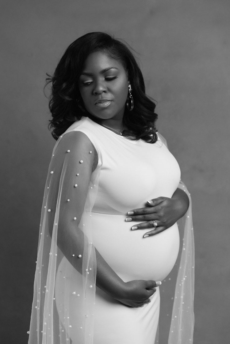 Make a graceful statement in this on-the-shoulder maternity gown, crafted from luxe four-way stretch fabric that moves with you and flatters your growing bump. Designed with a sleek, fitted silhouette and a soft short train, the look is elevated by a stunning mesh pearl cape that cascades from the shoulders—adding timeless elegance and gentle movement.