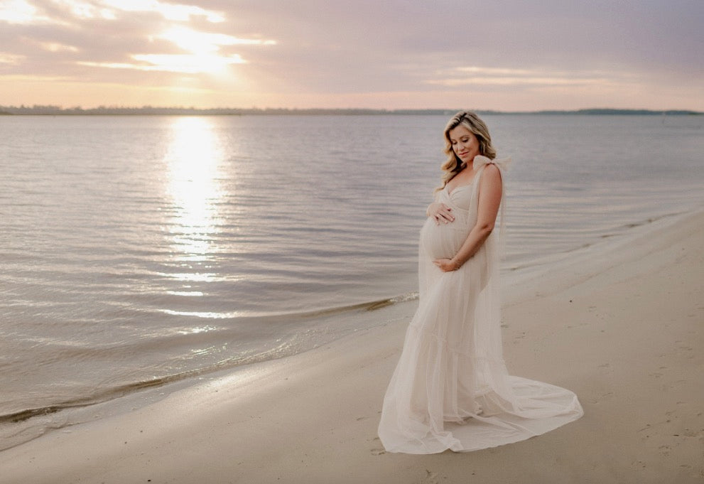 Romantic and ethereal, the Hannah Gown features a soft English mesh overlay with a flowy sheer finish and a fitted bodycon base. Designed with a sweetheart neckline, delicate bow-tie shoulder straps, and fully double-lined for comfort and coverage.