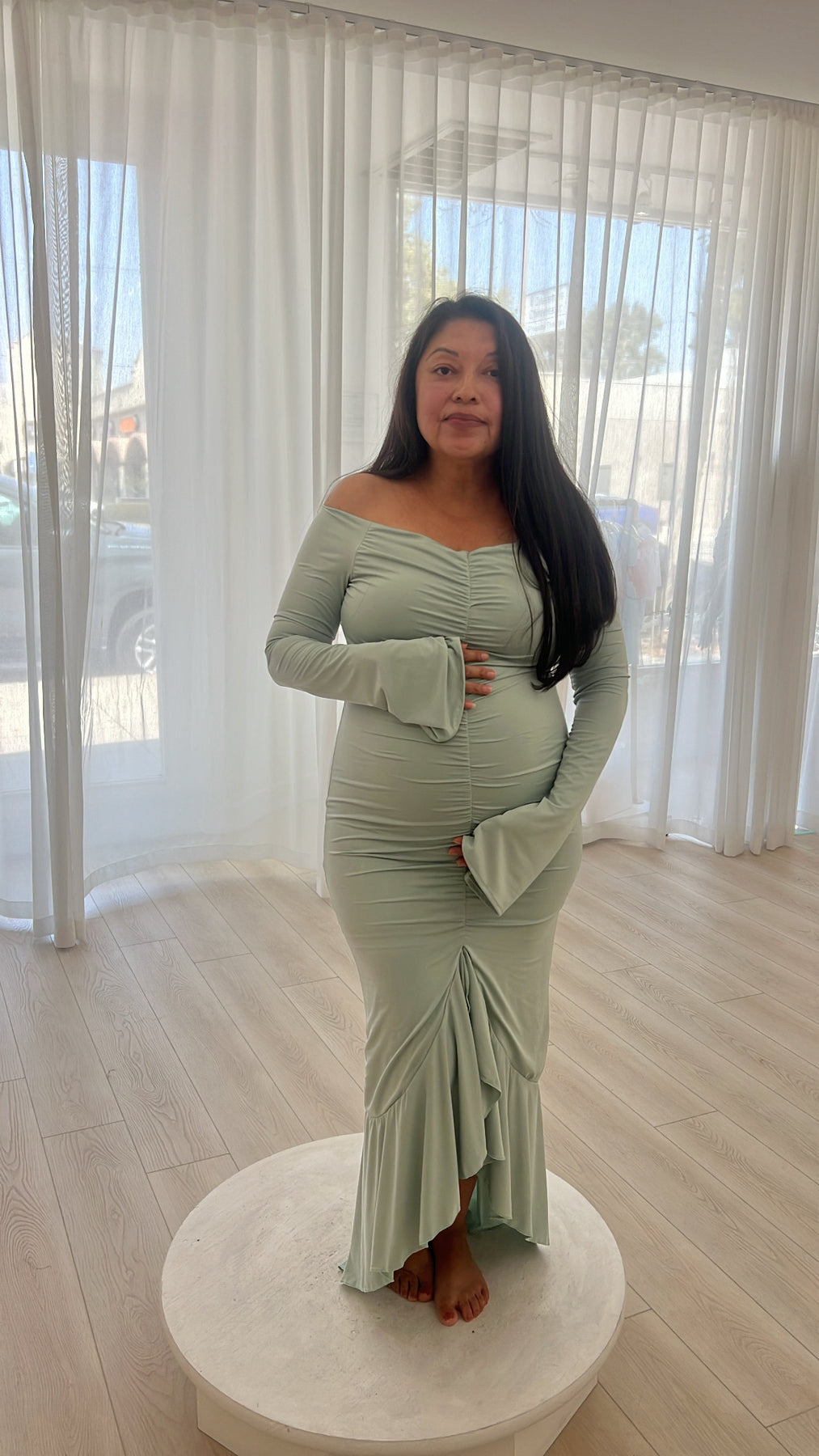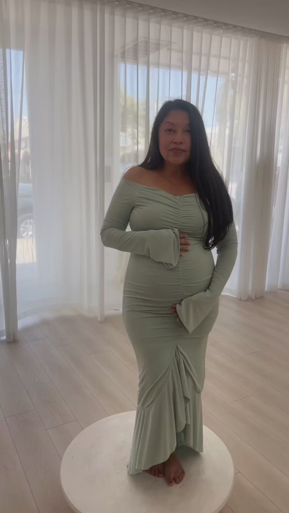 Soft, romantic, and refined — with off-the-shoulder bell sleeves, flattering ruching, and a ruffled hem. Perfect for your baby shower or maternity shoot.