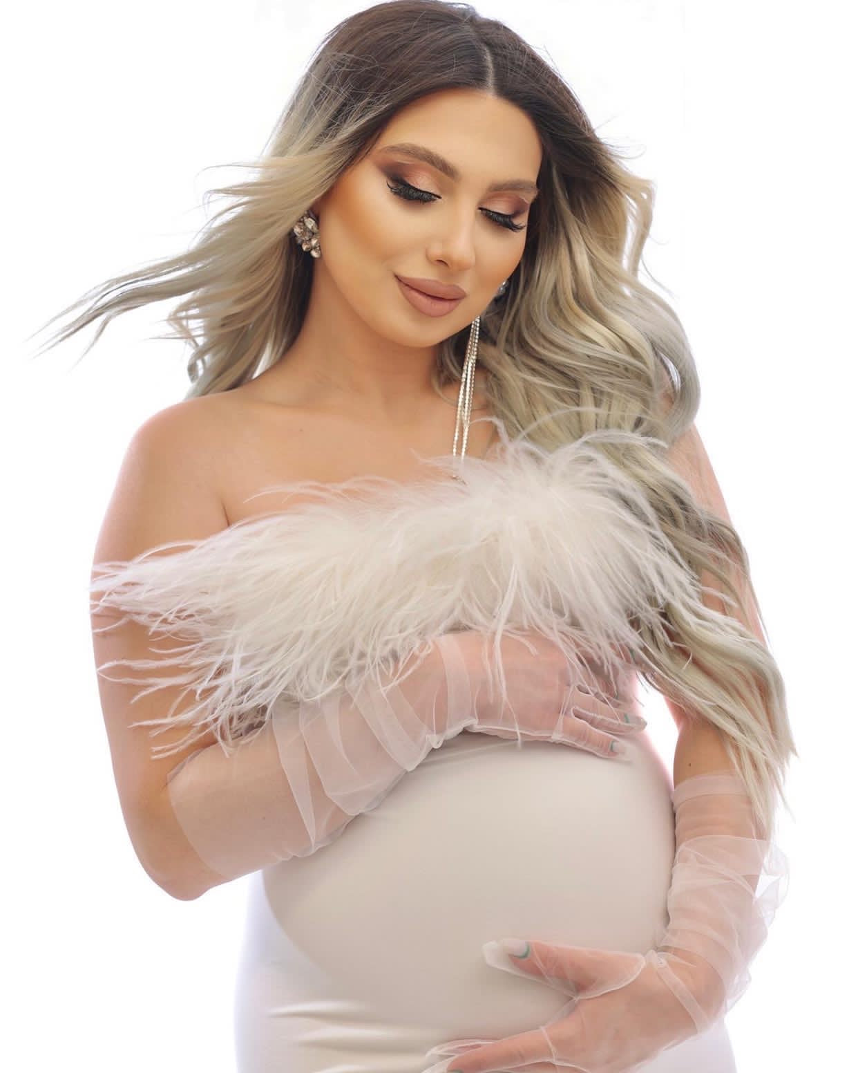 New! Our off-white Swan gown ! She features a sleeveless straight top with natural feather design. Her empire waist leads to a floor-length slim-fit silhouette. Pair it with mesh gloves .Gloves purchased separately.