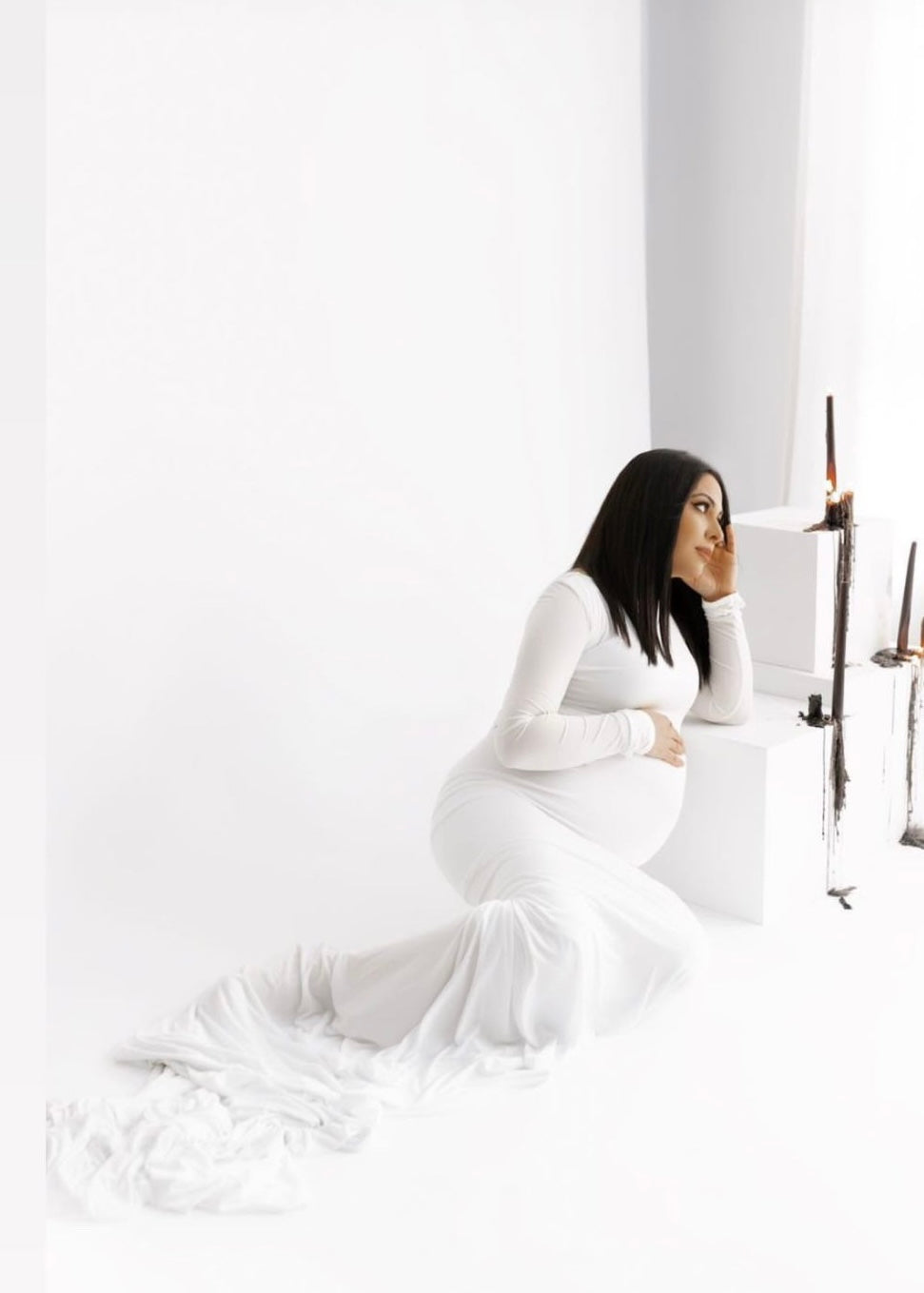 •Beautiful turtle neckline , fitted dress to show off your beautiful bump and long romantic train