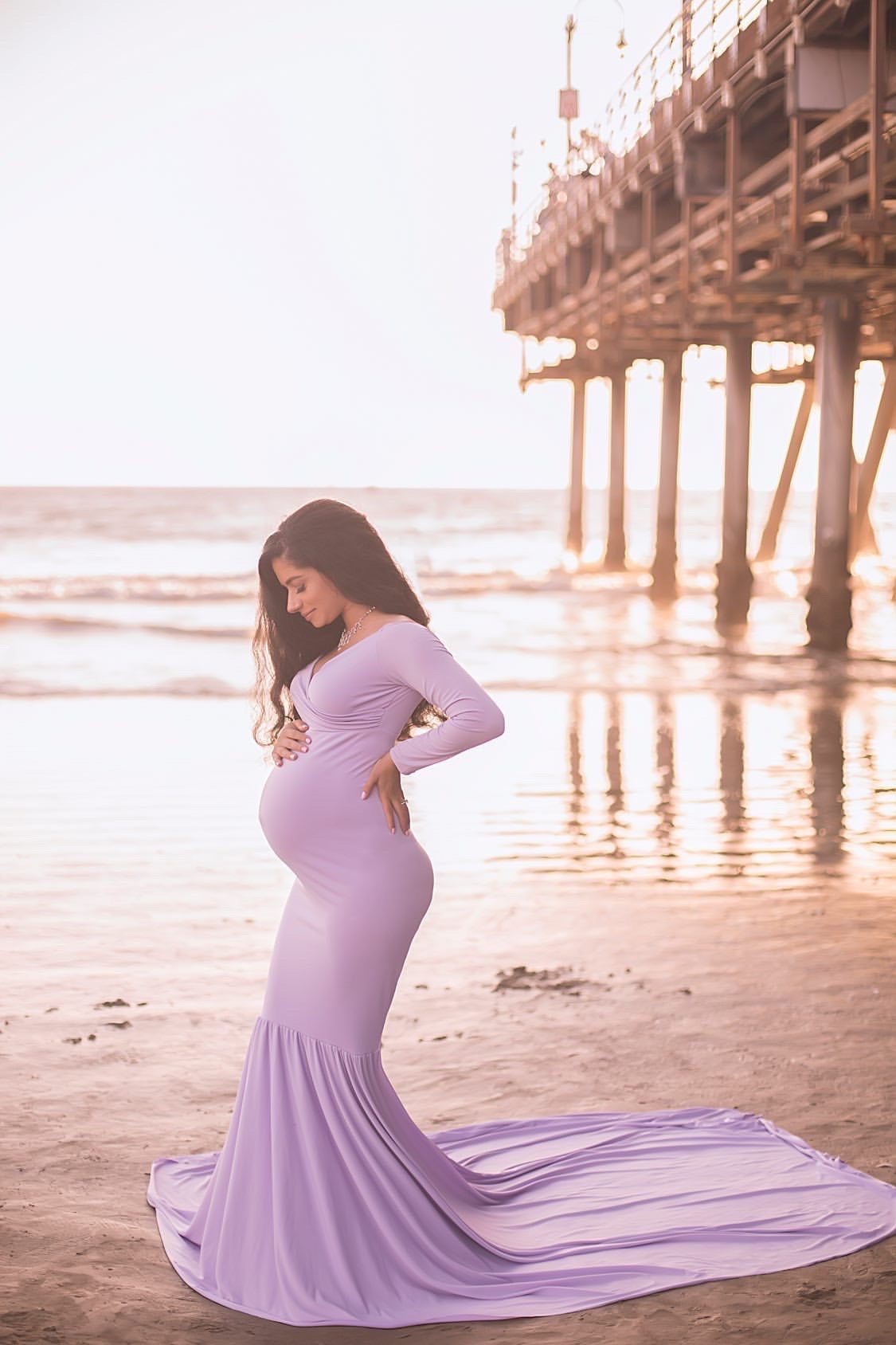 Slip into this stunning fitted gown designed to beautifully accentuate your bump. Crafted from soft luxury stretch fabric and fully double-lined for comfort and coverage, this gown features long, sculpting sleeves, and a dramatic flared train for an unforgettable silhouette.