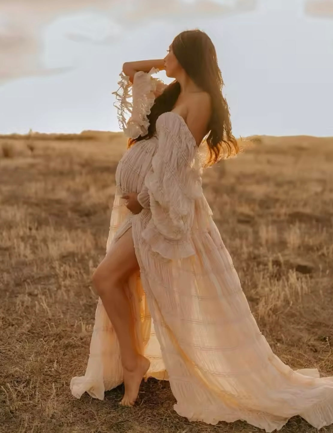 Embrace effortless beauty in this lovely boho-inspired maternity gown. Crafted from soft luxury stretch fabric, it offers comfort and flexibility while draping beautifully over your bump. The flowy silhouette and flattering leg slit create stunning movement—perfect for capturing dreamy photoshoot moments.
