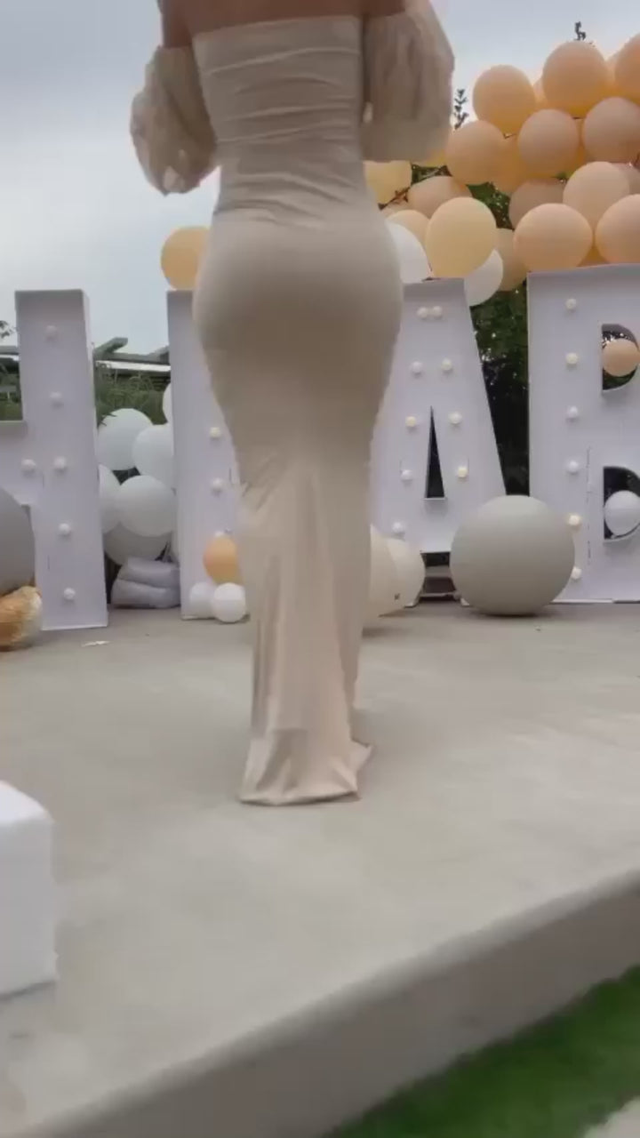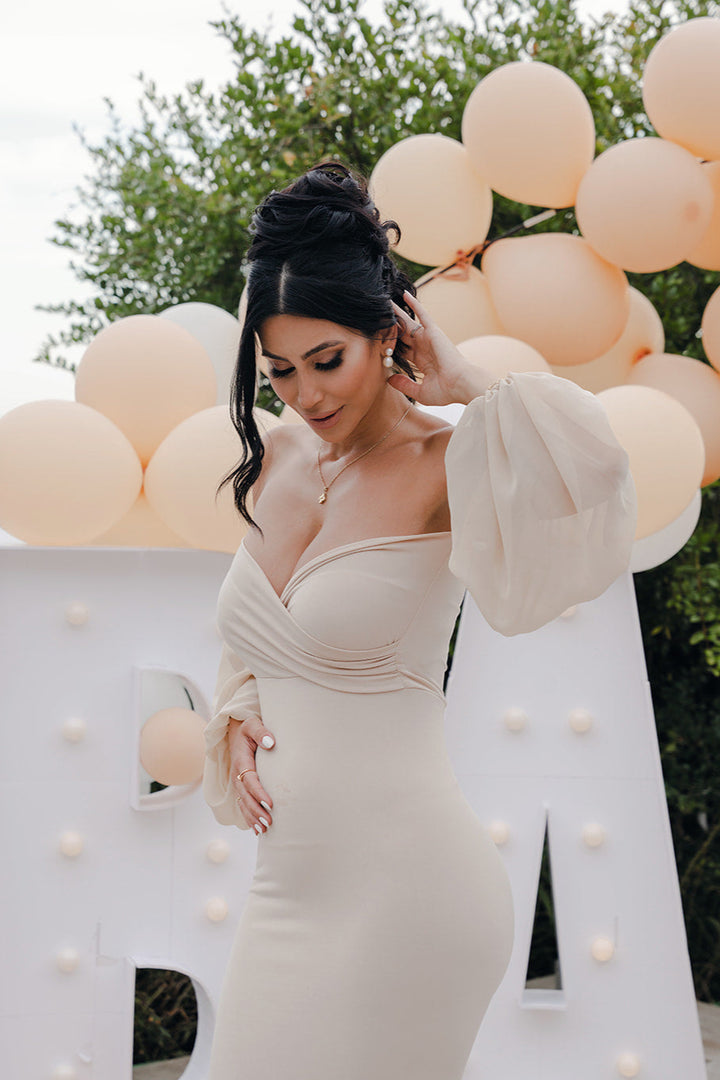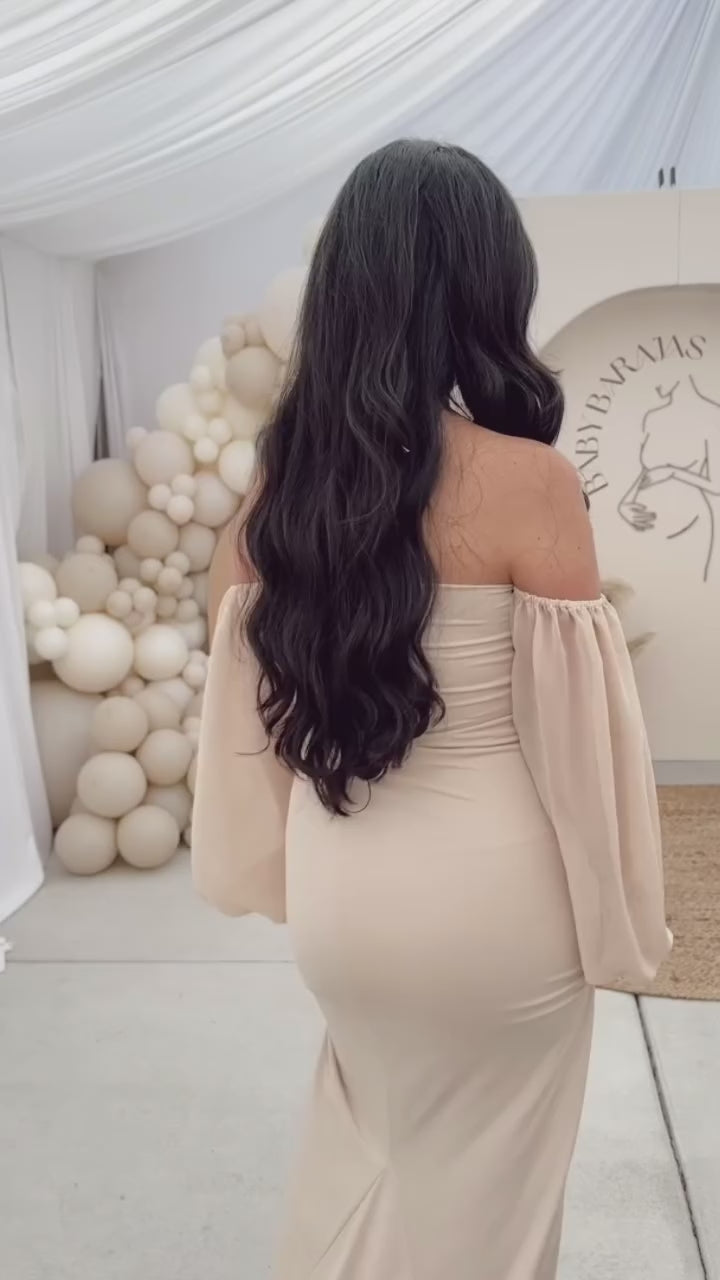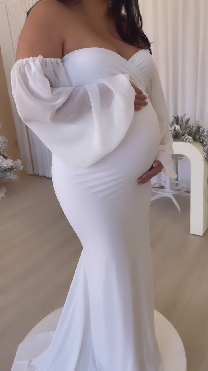 Designed to sculpt and flatter, this elegant maternity gown features a body-hugging fit with luxe stretch fabric and full double lining. The versatile off-shoulder neckline and long draped chiffon sleeves that add a romantic touch. Finished with a floor-length hem.