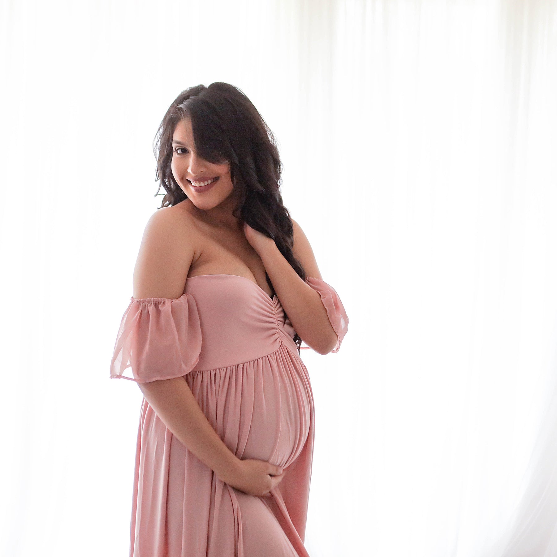 Beautiful maternity dress to show off your baby bump.Ideal for maternity photos. Please see other listing for baby shower and more covered dresses.