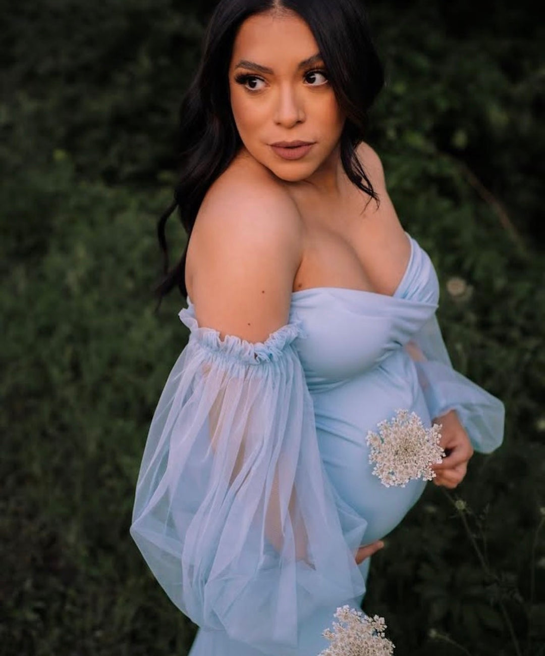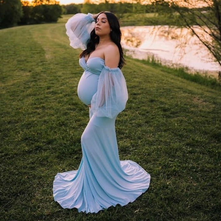 Elegant and chic! This timeless maternity gown features a romantic sweetheart neckline and a slim-fitting bodice, crafted from soft luxury stretch fabric that moves with you. Finished with a dramatic extended train, perfect for capturing stunning photoshoot moments. Detachable tulle sleeves add a dreamy, ethereal touch.