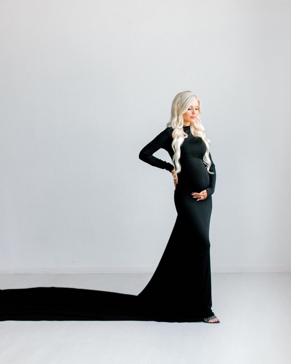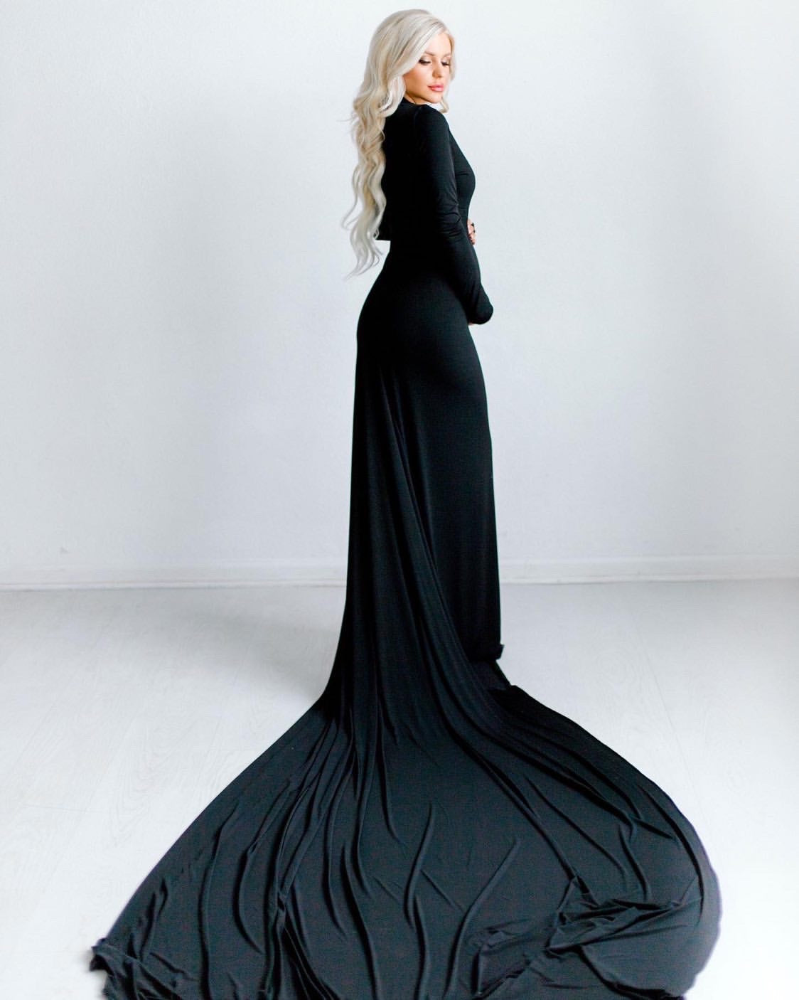 •Beautiful turtle neckline , fitted dress to show off your beautiful bump and long romantic train