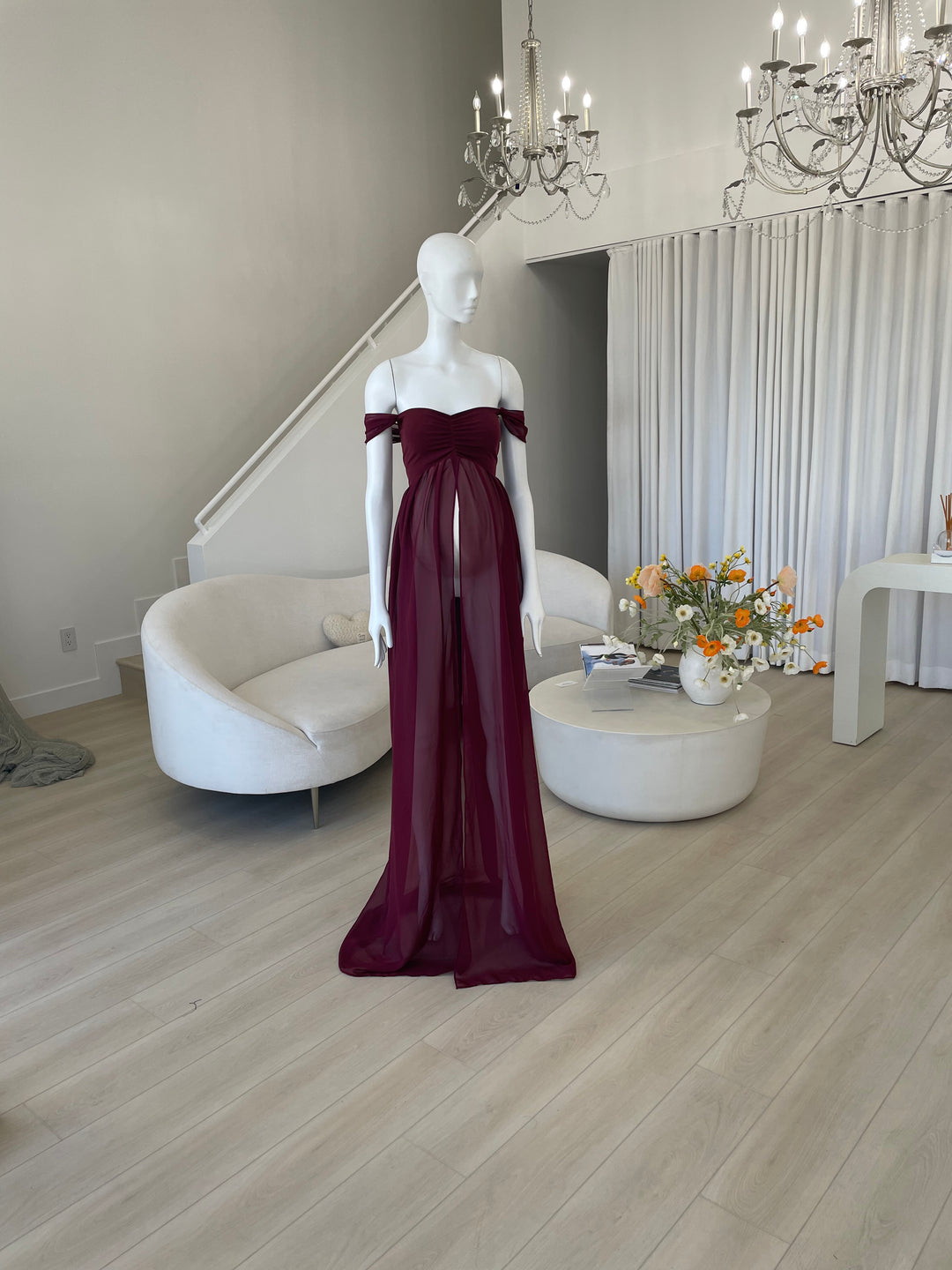 The perfect maternity photoshoot dress! This one-item set includes a burgundy, open-belly dress with shorts for ideal bump display. Ideal for fall and wood photo sessions, fits sizes ranging from Medium to XL. Feel beautiful and capture a gorgeous memory of your pregnancy!