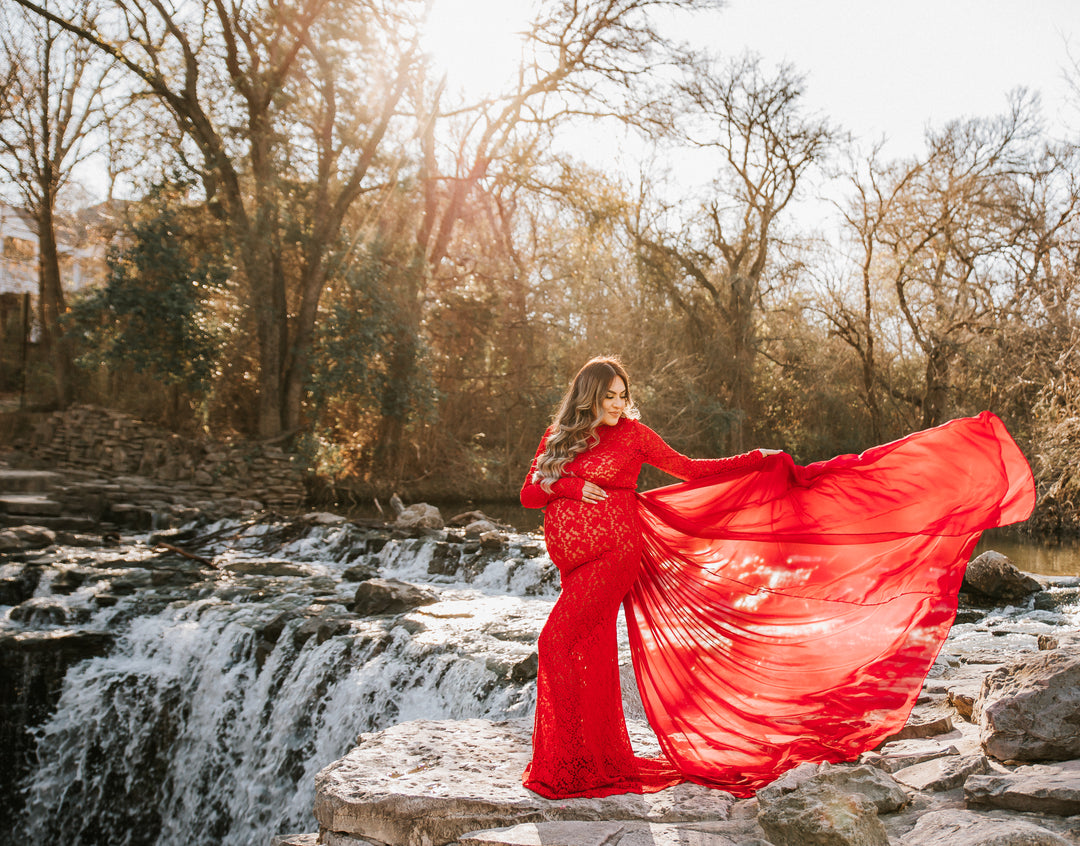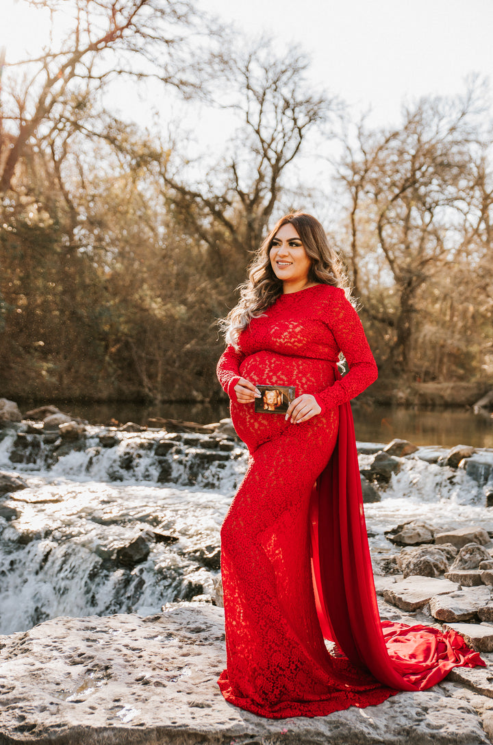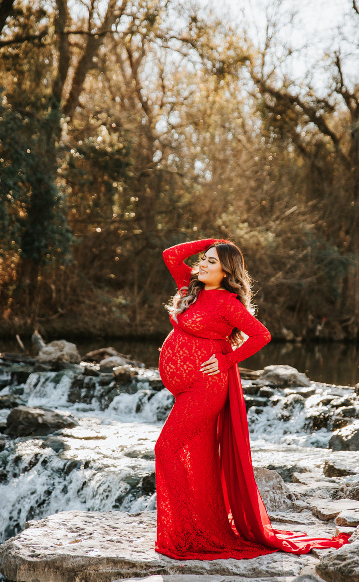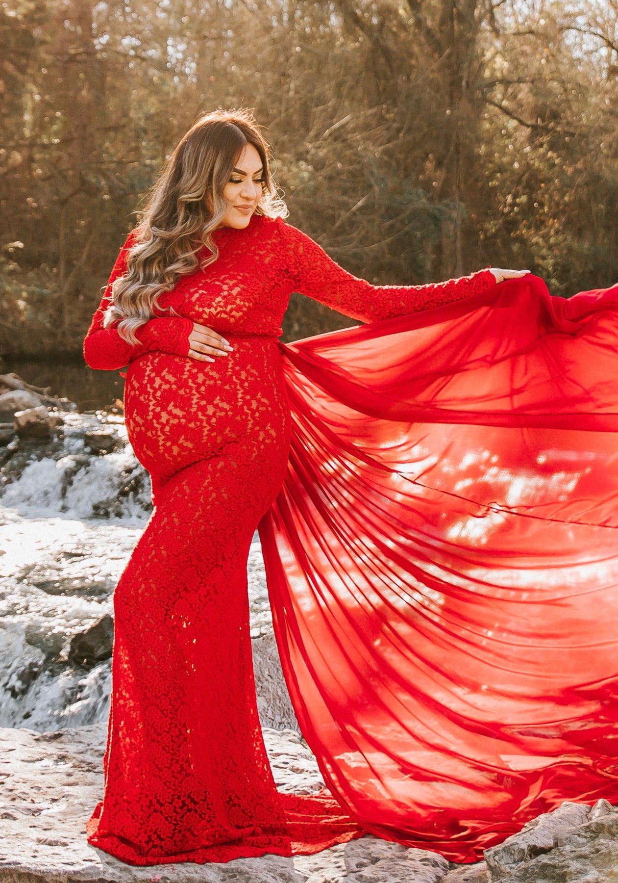 Slip into this beautiful handmade  Lace fitted gown to accentuate your beautiful bump, with a flaring train. It comes with 6 yard detachable chiffon .This gown is very elegant and romantic. It comes with nude slip underneath for coverage.